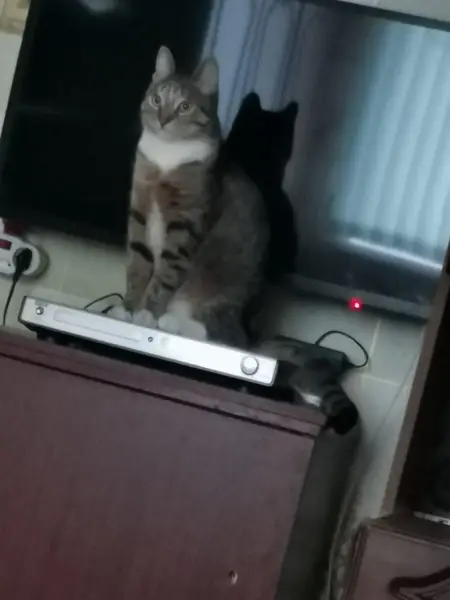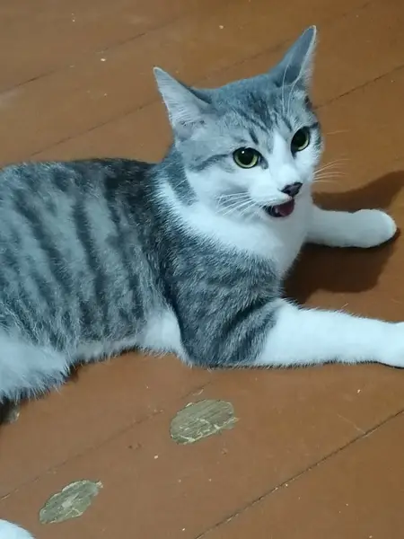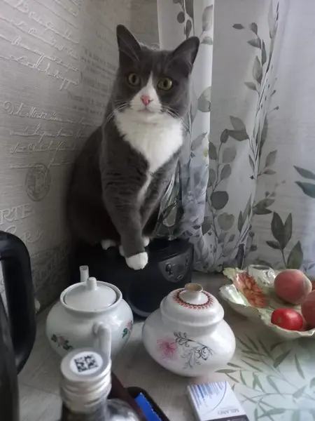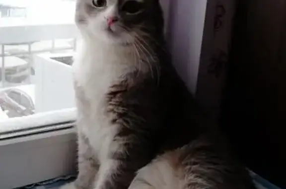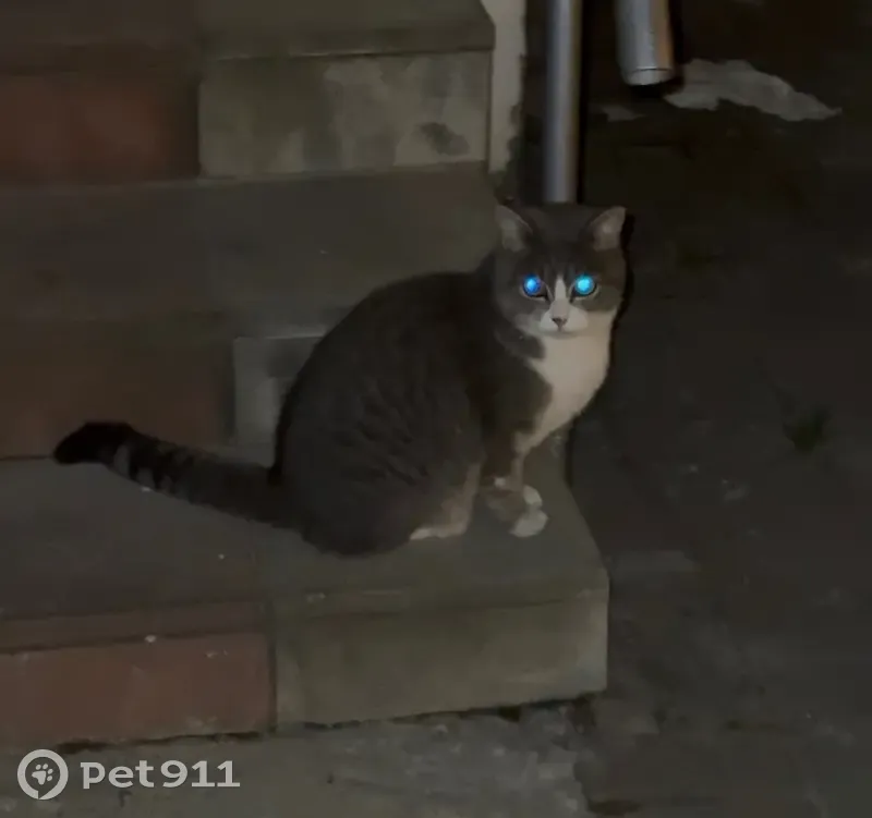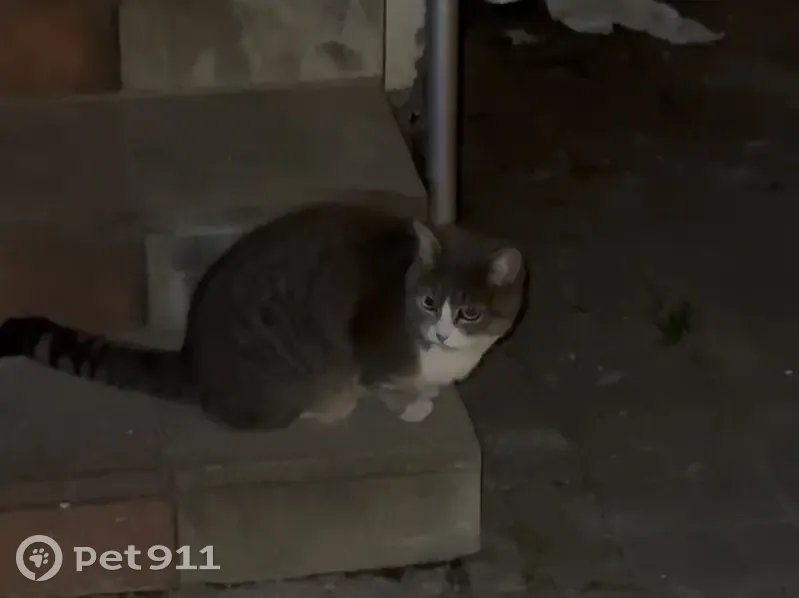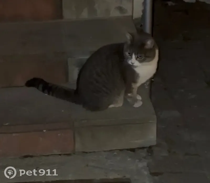 Найден котик/кошечка, серо-белого окраса. Упитанный, чистенький, ласковый. Сидит у первого подъезда дома номер 10, Усово-Тупик. Хромает на заднюю лапку, как будто упал с высоты.