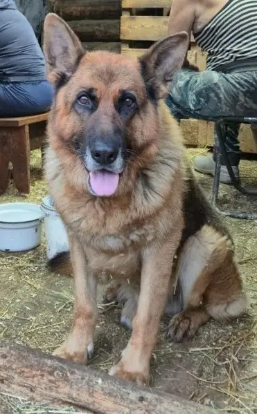 Кобель немецкой овчарки (возможно метис), предположительно пожилой. Левое ухо не совсем стоит (это видно на фото). Также имеется ошейник как отличительная черта.