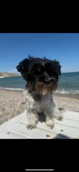 Порода Цвергшнауцер, чёрный окрас, яркий ошейник, старенький, скорее всего глухой.