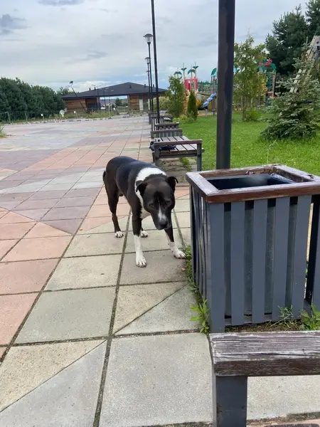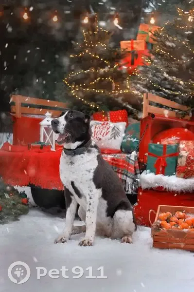Чёрно-белая алабайка, вес около 60 кг, на животе клеймо. На шее висел намордник. На ошейнике номер телефона +7(917) 511-71-71. От взрывов салютов сбежала в лесу. Последний раз её вчера видели в центре Одинцово