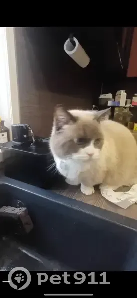 Окрас белый с серым, передние лапы короткие, порода манчкин. На шее голубой ошейник с адресником. Выбежал поздно вечером на улицу и не вернулся.