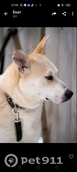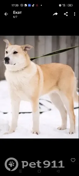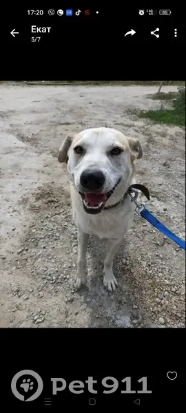 Девочка Мия, похожа на лабрадора, на ухе бирка о стерилизации, пугливая. Взяли из приюта -убежала. На шее тёмная веревочка.