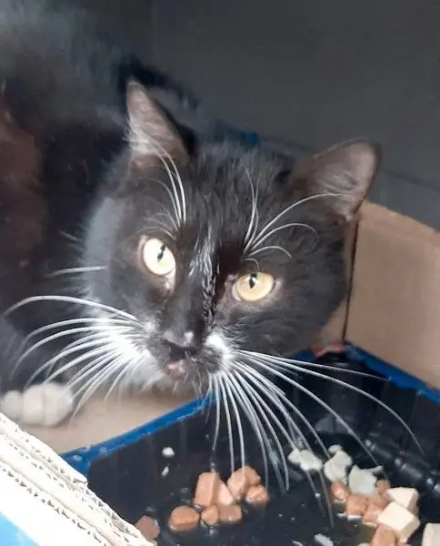 Черная кошка с белыми пятнами, живот почти полностью белый упала с балкона, часто прячется под машинами и в укромных местах