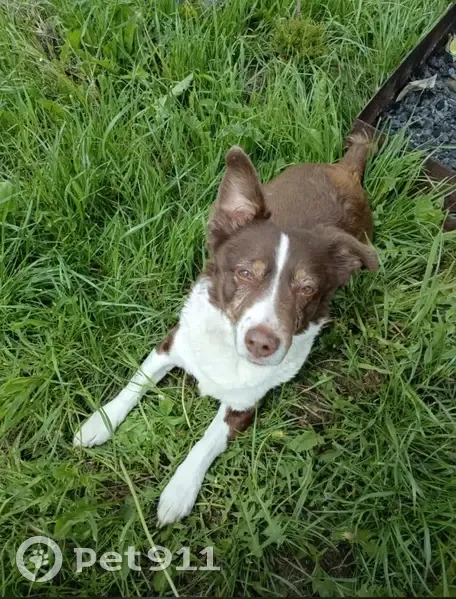 Пропала во время грозы, была без ошейника. Окрас бело-коричневый, хвостик немного согнут