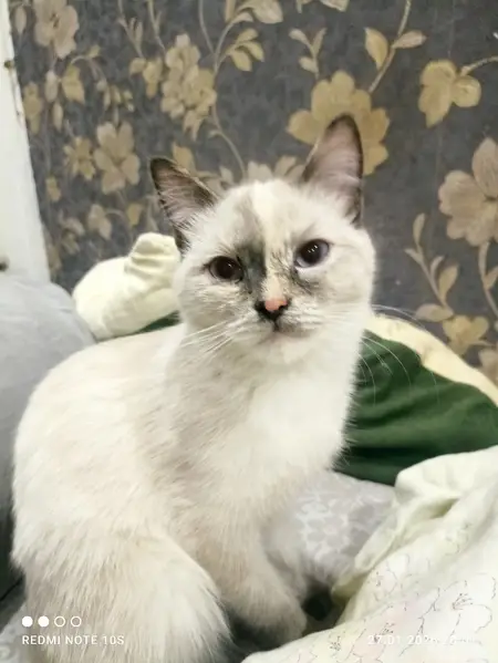 Сиамская кошка, белые лапки, голубые глаза, жирненькая, шерсть средней длины, обломан правый верхний клык.