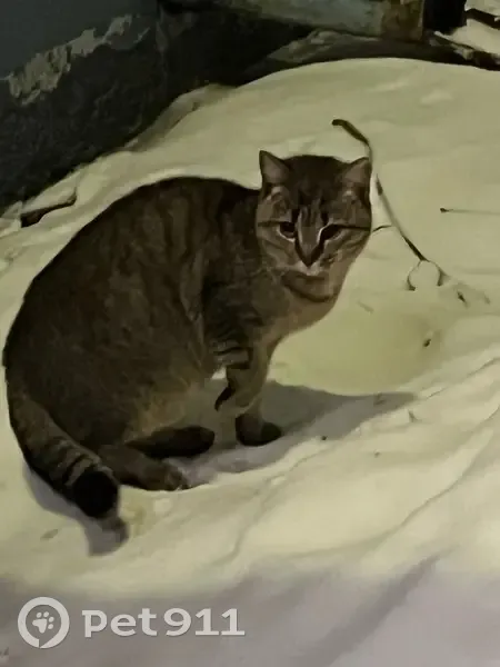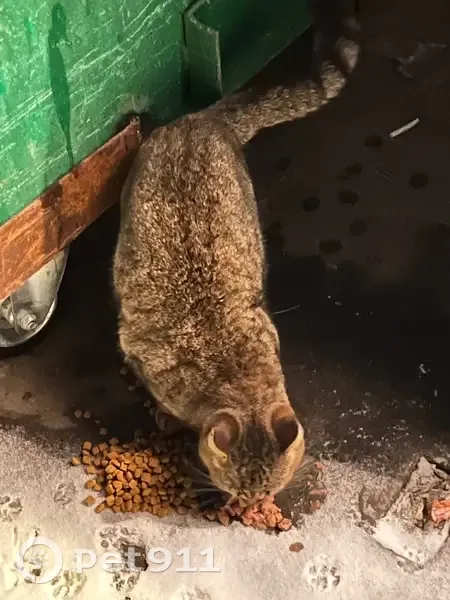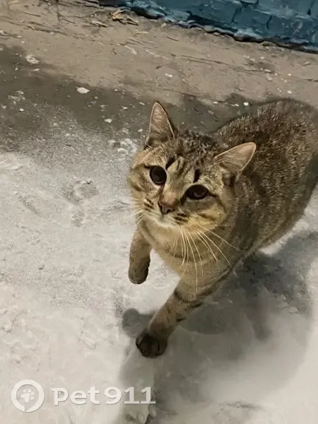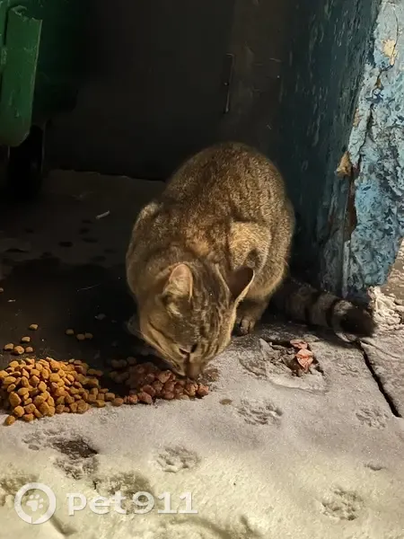 Котик полосатого окраса серо-коричневый бегает за всеми ищет хозяина, видимо только потерялся. Очень ручной, ласковый, чистенький