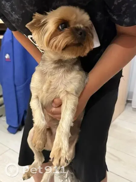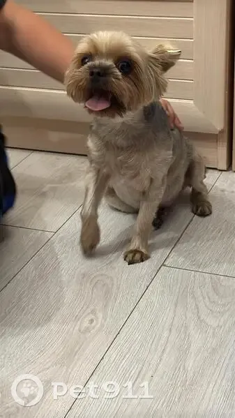 Йоркширский теьер(кабель) на вид 4 года, ухоженный, послушный. Пробывали чтоб показал куда идти (не куда не ведёт). Пришёл в цветочный магазин Без посредников. Ждём хозяйна. Реагирует на сына 8 лет (видимо у него в семье есть ребёнок).