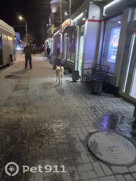 Здравствуйте,в районе Главпочтамта бегает кобель,руки нюхает,не идёт следом,как будто ищет кого то ,сняла на фото сегодня,нарезает прям круги от остановки,до подземки и к скуратову,ошейник кожа,руки главное нюхает,потеря о колено и убежал,ухоженный