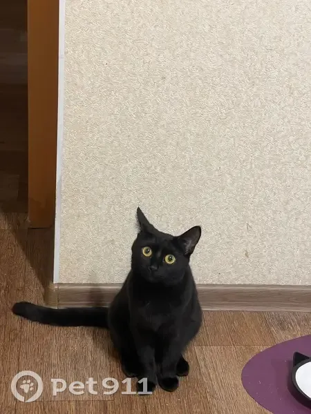 Черная кошка с желтыми глазами. На грудке есть немного белых волос и по телу единичные. Отзывается на имя Марси. Боязливая. Реагирует на валерьянку и жидкий корм.