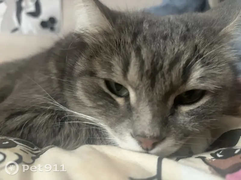 Светло-серого окраса, черно-белые полоски. Белая грудка, и белые носочки на лапах. Длинные усы. Крупный, с зелёными глазами. Вышел вечером из дома и не вернулся.