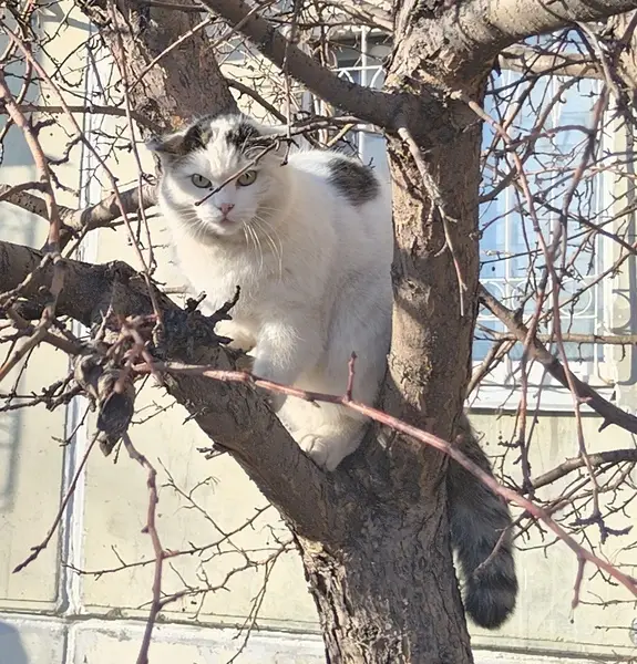 Вислоухая кошка, серый хвост,уши и пятнышки на спине. Возраст 6 месяц, весит около 2.5кг