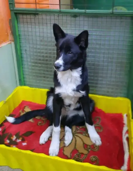 Окраска: черно-белая. Белое пятно ближе к холке. На шее густая шерсть. На лапках черные яркие пятна. На собаке остался лаймовый ошейник. Собака средних размеров, немного боязливая, но ласковая