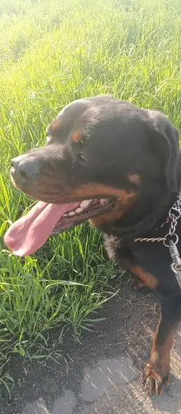 Очень огромный пес. Черный с огнено рыжий окрас На нем одет намордник черный или просто висит на шее, потому что он умеет его снимать. Собака очень умная, добрая, контактная.