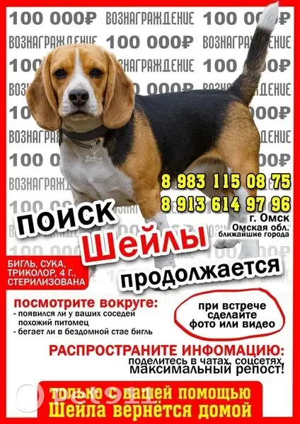 Убежала с передежки, Бигль яркой окраски, спина черная, ноги белые с рыжими пятнам, кончик хвоста белый (3 см) , стерелизованная, нос не прокарашен. Мы очень любим нашу Шейлу , ищем и ждём ее дома.