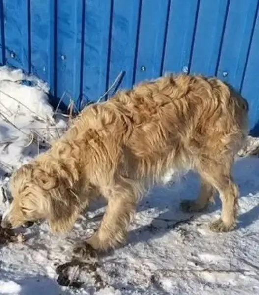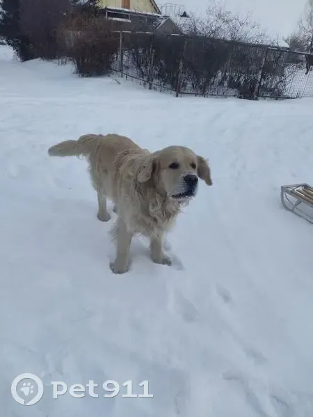 Золотистый ретривер, крупный кобель, добродушный, любит всех облизывать и кушать. Убежал с дачи, предположительно с другими собаками, мог перебежать Иртыш и уйти в сторону Черемушек