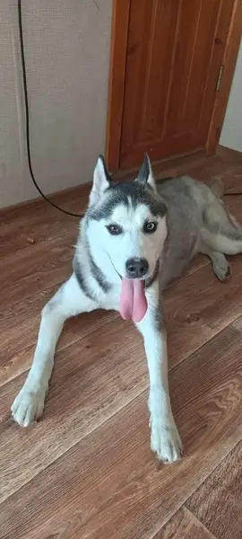 Хаски, серого цвета , очень ласковый, умный, есть две родинки на верхней губой ,ушко с небольшим питном белым окрас такой, есть не большая болячка на морде, была операция на лапе, шерсть не сильно зарасла, кличка Хан.