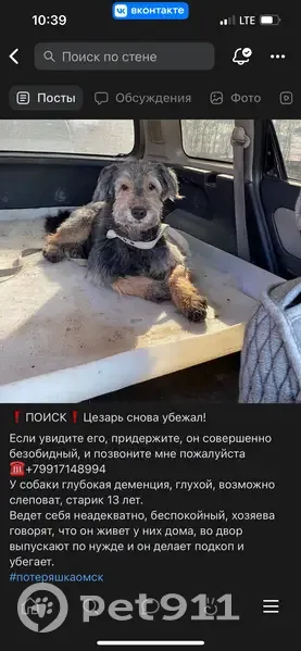 Цезарь, 13 лет. Находится в глубокой деменции, не агрессивен. Может быть в любом месте города. Если увидите позвоните пожалуйста по телефону ️ +7 913 654‑37‑14
