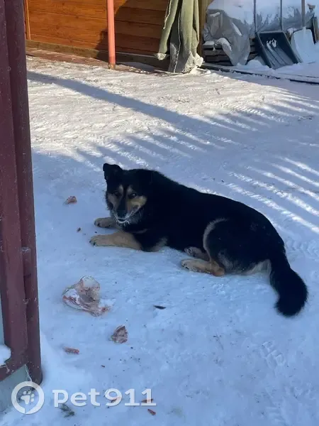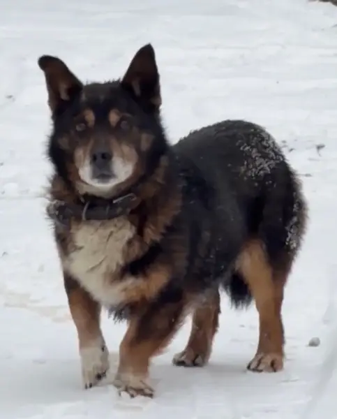 Чёрный с желтым, похож на овчарку на коротких ножках