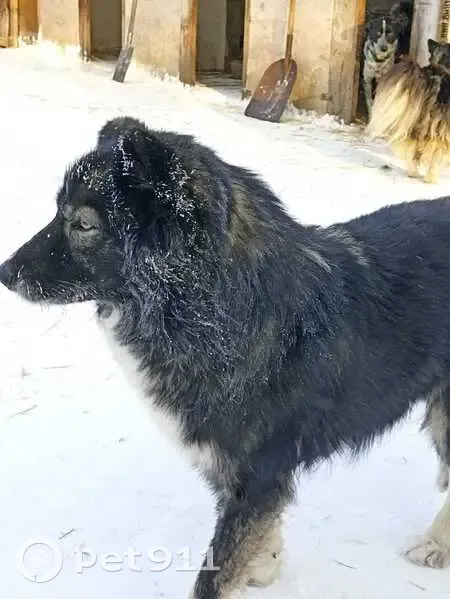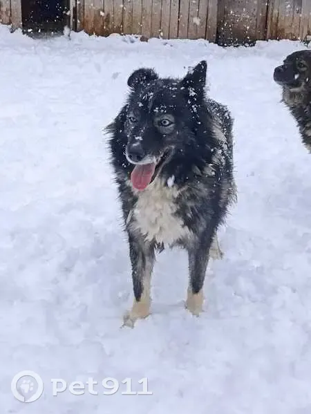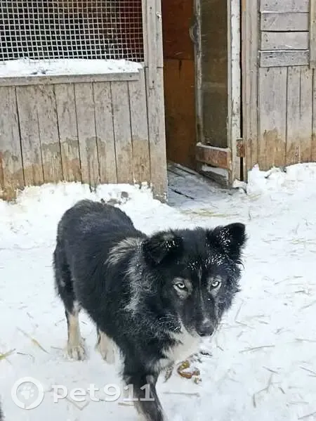 Собака с ярко-голубыми глазами. Похожа на бордер-колли.