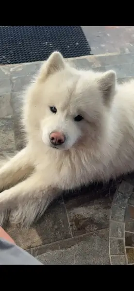 Найден САМОЕД кобель , возраст 3-4 года в наморднике и без ошейника. Знает команды. Плачет, хочет домой!!! Долго у себя держать не смогу!!!