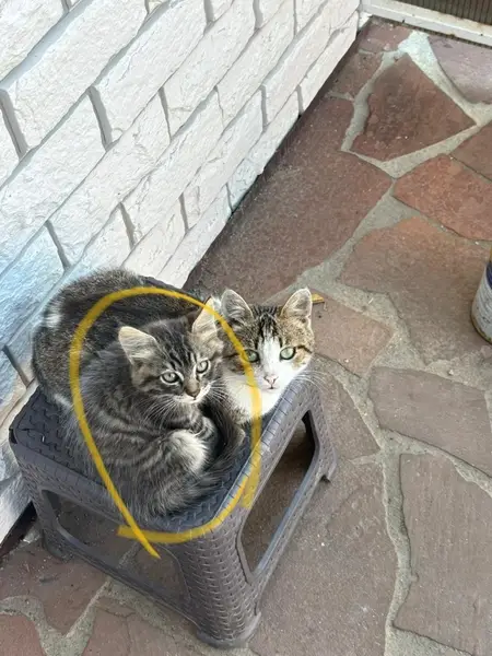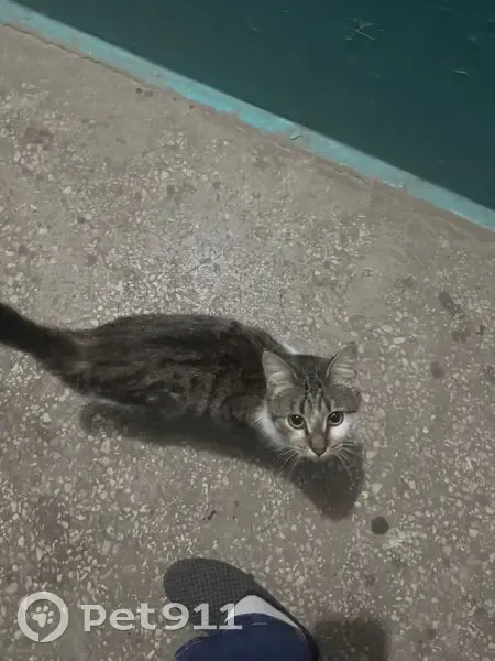 Небольшая полосатая девочка, глаза жёлтые, лапки белые. Заметили её на первом этаже в подъезде, кошка выглядит очень ухоженной, возможно, жила на первом этаже.