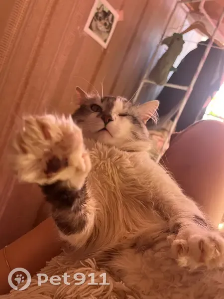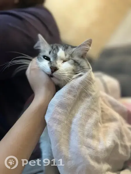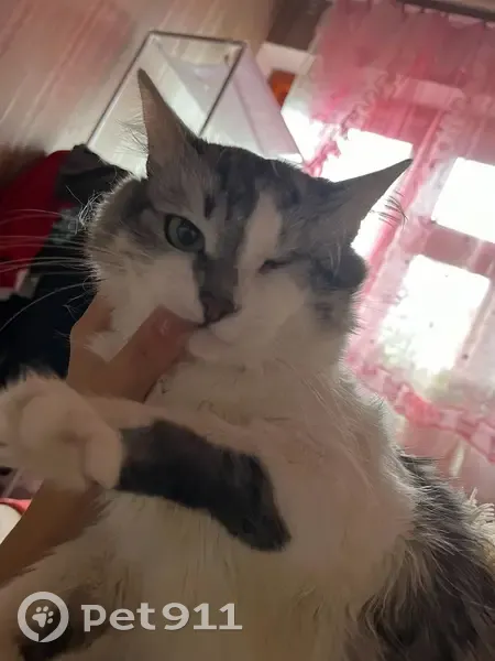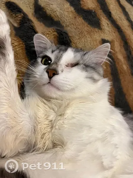 Крупного телосложения, светлая шерстка, смешанная с черными пятнашками. Одного глазика нет. Достаточно пушистый и ласковый, но на улице может быть пуглив