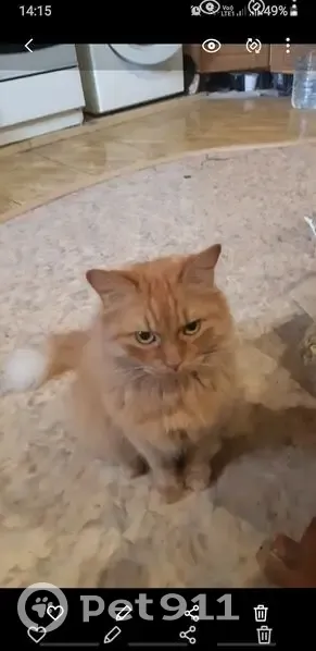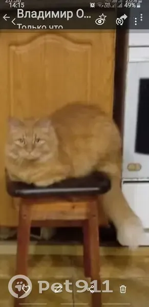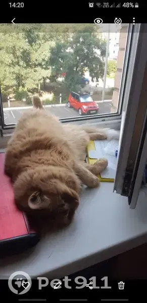 Кот,взрослый,полностью рыжий, с белой кисточкой хвост,пушистый. 13 лет, вес 6,5кг. В усах кроме белых есть немного чёрных. На нижней десне слева пигмент,это возрастное,незаразно. Под левой лапой снизу есть жировик размером с небольшой орех,меньше грецкого. Беспородный, найдёныш,полностью домашний,пугливый. Дома не обижали, убежал случайно хотя на улицу не выпускали,гулял на балконе и на окне.