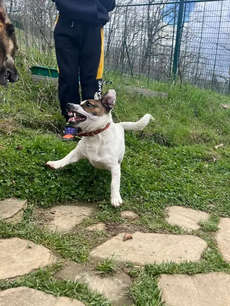 Белый Джек-рассел-терьер с двумя пятнами на мордочке, была в красном ошейнике, громкая собачка, любительница облаять.