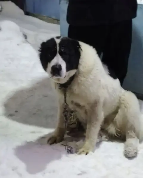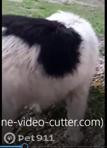 Размер средний, до колена, вес - около 10-12 кг, очень пушистая, белая с черными пятнами на спине и у хвоста, на голове черная шерсть, глаза карие живые, очень приветливая, голос звонкий. Стерилизована. Без ошейника. Предположительно, была отловлена и вывезена.