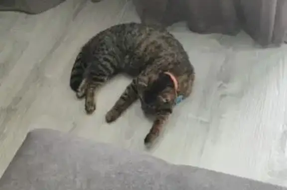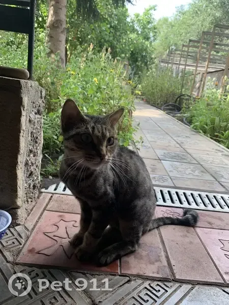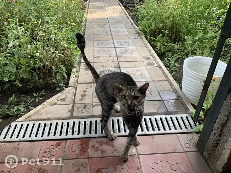 Окрас черно-серо-коричневый полосатый Кошка стриженная (вероятно грумером), на кончике хвоста кисточка Очень скучает и много мяучит, очень худая Живет у нас на огородах, точную дату, когда она появилась, сказать не могу