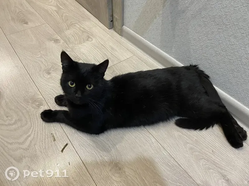 Спокойный, ходит в лоток, глаза зеленые,окрас черныи, не кастрирован, нашли у подъезда
