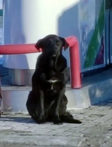 На АЗС бегает черная собака, очень контактная, бегает за каждой машиной. Вся черная, на груди небольшое белое пятно, молодая.