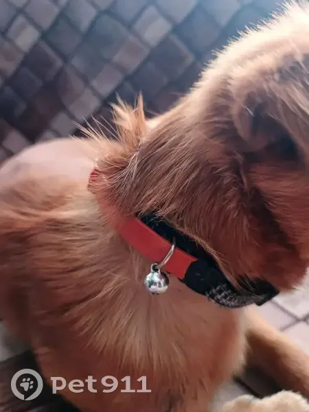Собака рыжая, с двумя ошейниками, на одном ошейнике колокольчик