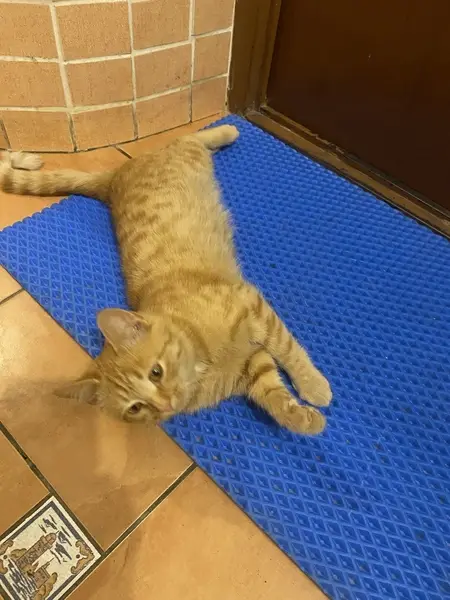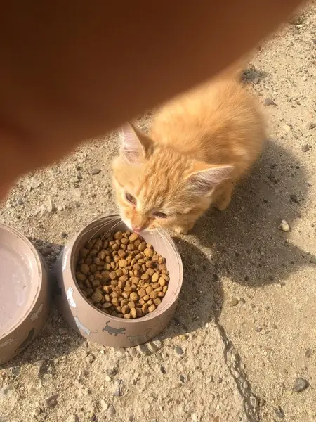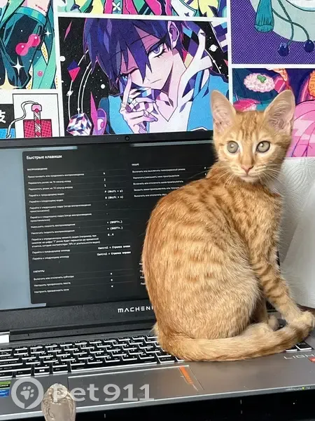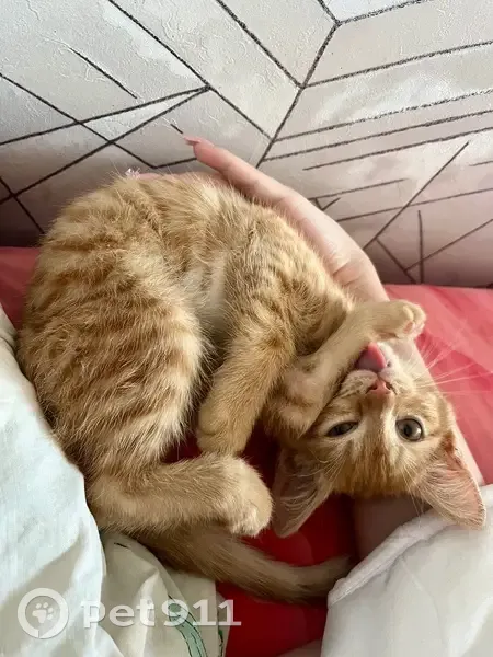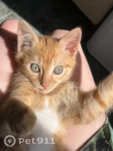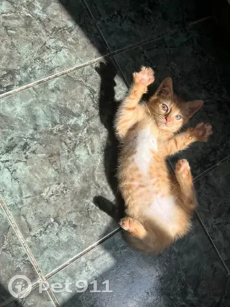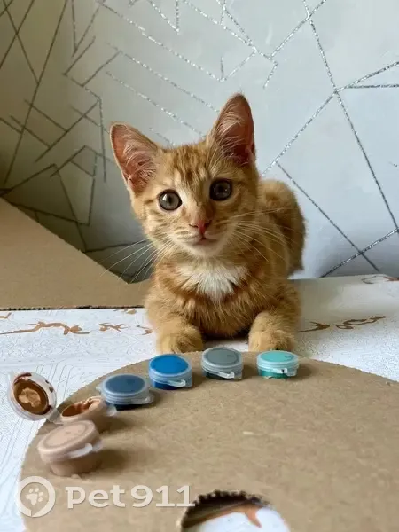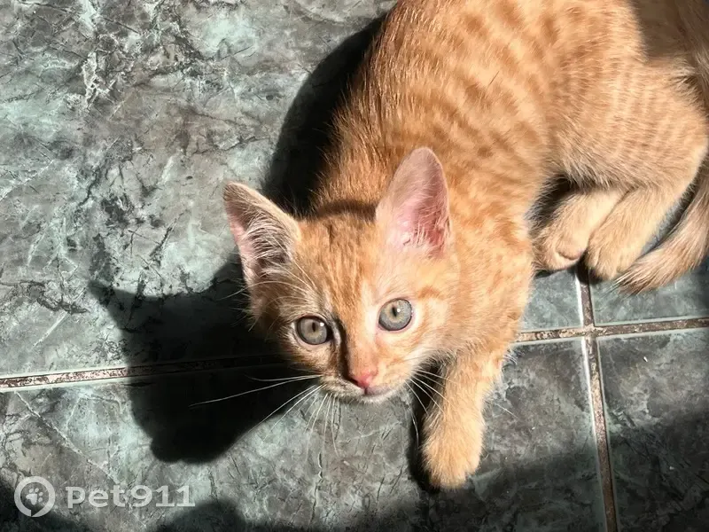 Рыжая кошечка с зелёными глазками. На грудке белый галстук. Большие ушки. Небольшая - ей 4 месяца. По всей видимости упала с окна. Очень игривая и ласковая.