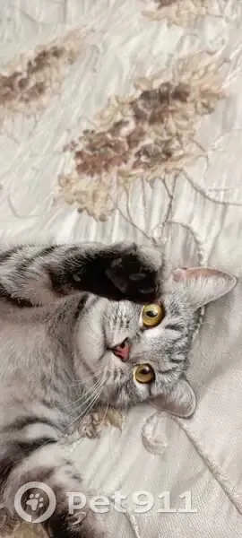 Серый в чёрную полоску, есть шов от стерилизации, живот в крупную пятнышку как леопард