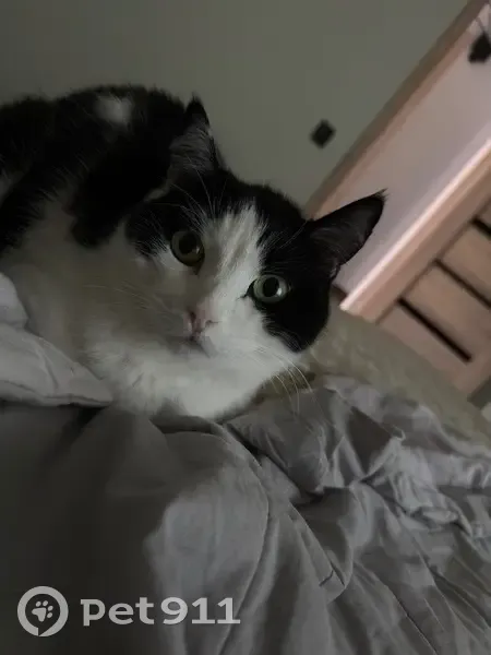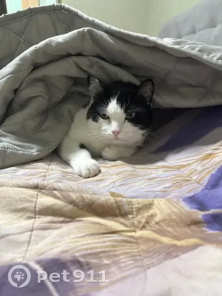 Черно-белый , кастрированный кот . Среднего телосложения . Очень пугливый . Выбежал из дома. Кот среднего телосложения , с торчащими ушками . Отсутствует один клык