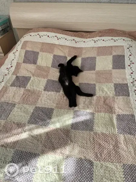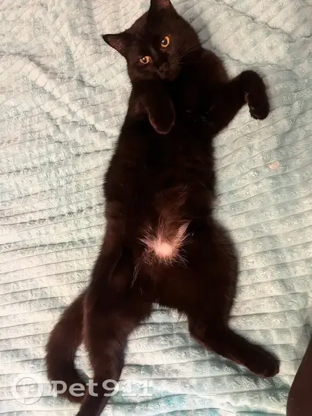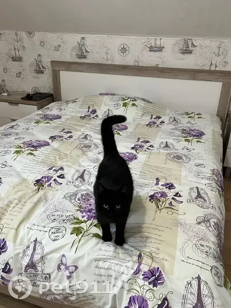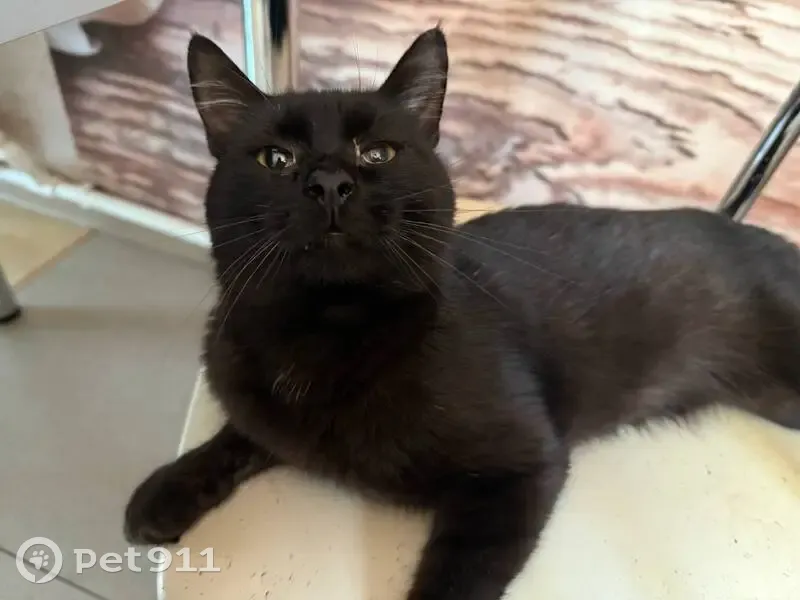 Мальчик среднего размера, некрупный, шерсть полностью черная, на грудке несколько белых волосинок, на животике белое пятно, глаза зеленые. Немного хромает. Потерялся в районе снт р. Сакмара