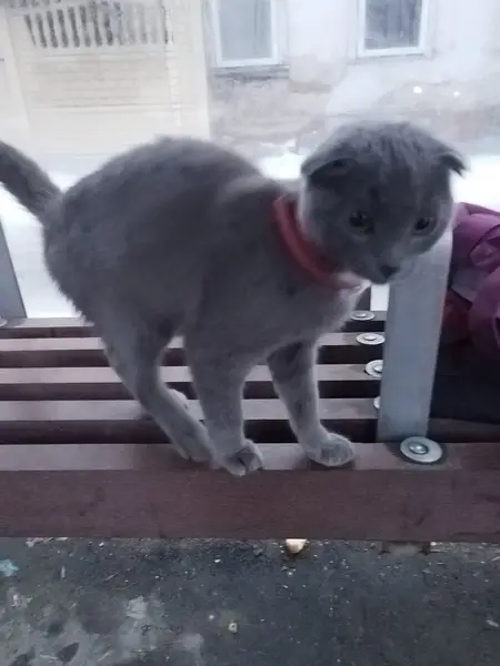 Шотландская вислоухая , серый окрас,зеленые глаза. Кошка немного дикая, боится людей. Отзывается на имя Багира.