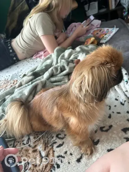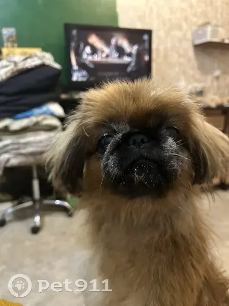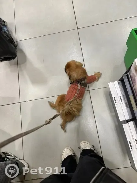 Выбежала из двора частного дома. Очень любит ходить по траве, носиком травку нюхает, что-то в ней копает, в сухих листиках любит валяться. На других собачек обычно гавкает, очень тонкий и звонкий голосок. Видно, что давно не стриженная. На хвостике дредина свалялась. Одета в вязанный свитер рыже-коричневый. Порода пекинес. Так же на ней шлейка и поводок. Поводок связан в нескольких местах (любит с ним играть и грызет). Глазки слезятся. Откликается на свое имя хорошо. На мордочке вселенская печаль обычно. К людям идет хорошо. Ласковая. Кошек не любит.