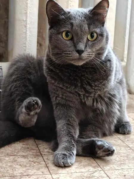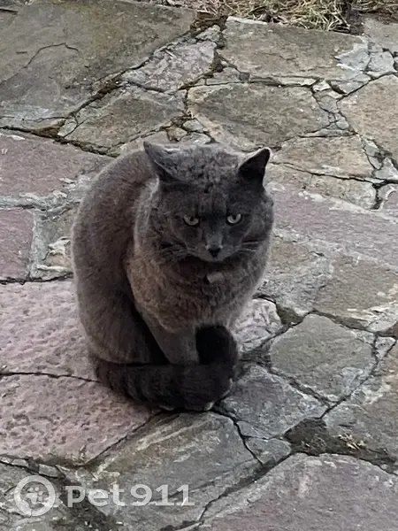 Окрас темно серый( мокрый асфальт). Вероятно котик. На вид 3-5 лет. Пугливый. Но кушать подошел.