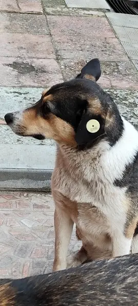 На вид без породная собака, девочка, возраст неизвестен, сидела на перекрестке улиц, очень спокойная и немного напугана.Окрас коричневый, но присутствует черный и белый местами.