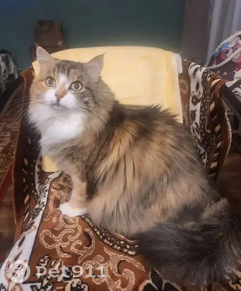 Отзывается на имя Маргоша, пугливая. Окрас: светло-серая, с чёрными и рыжими отметинами, белая грудка и мордочка, глаза светло-зеленые. Кошка крупная, упитанная.
