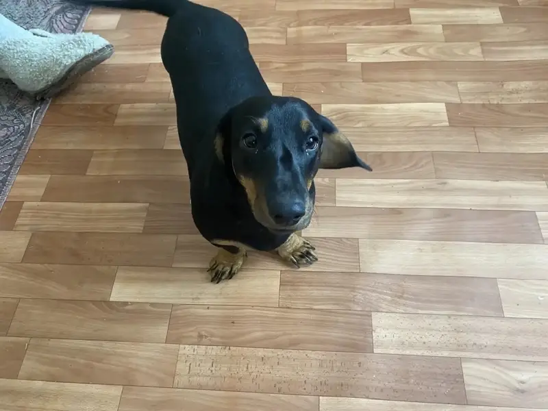 Доберман. Девочка. Чёрная с коричневыми подпаломи. Сорвалась из ошейника и убежала. Собака домашняя. В общественных местах не бывает. Зовут Юта.