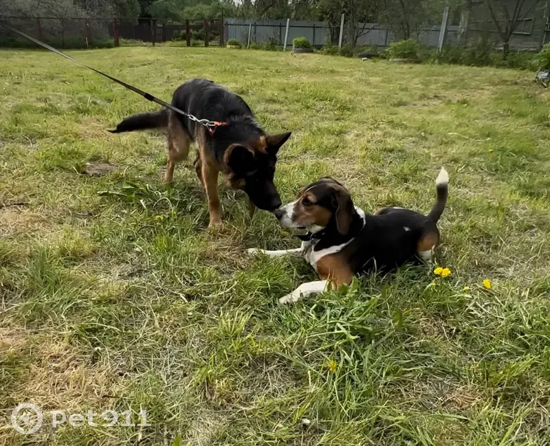Кобель. Порода: Эстонская гончая Найден в черном кожаном ошейнике. Знает команды, предположительно обучен навыкам охоты, встает в позу и указывает вектор при виде мелкой дичи. Добрый, ласковый, разговорчивый.