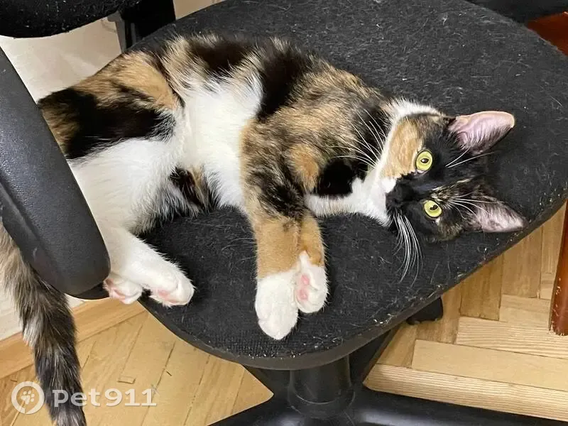 Трёхцветная кошечка, белые лапки и грудка, чёрный носик.