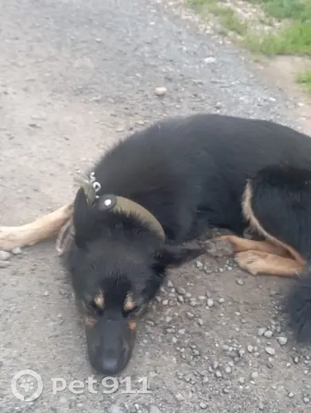 Молодой пёс мальчик ,цвет русый подпалый ,с зелёным ошейником,карий цвет глаз, спокойный