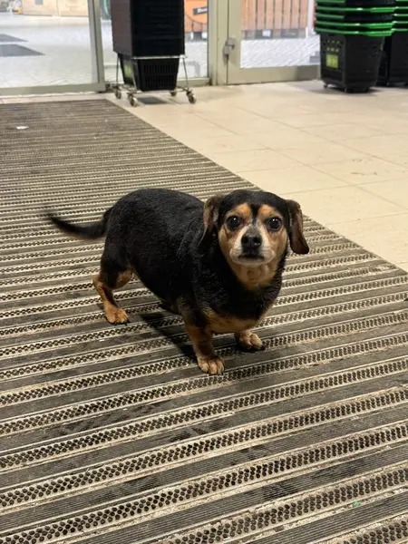Найдена такса! Старенькая, девочка, окрас черный с пятнышками на морде, груди, спинке, на ней черная шлейка.