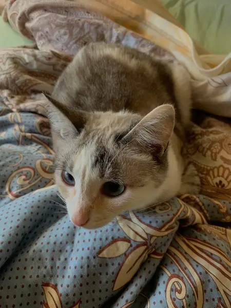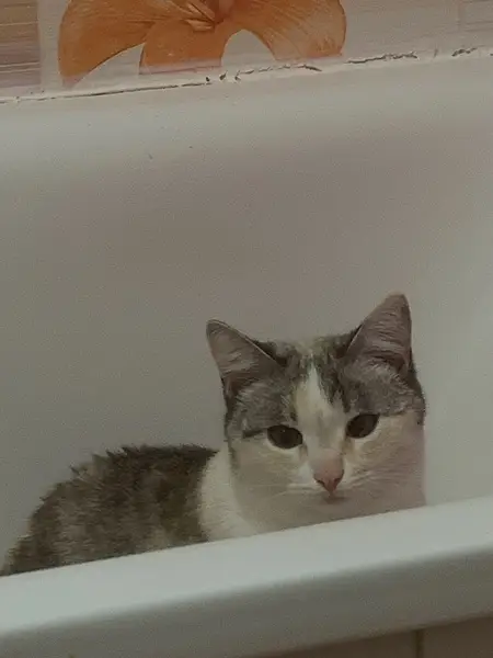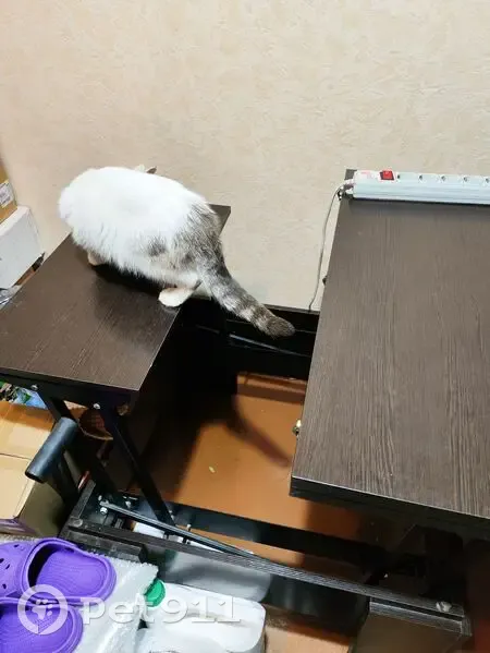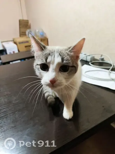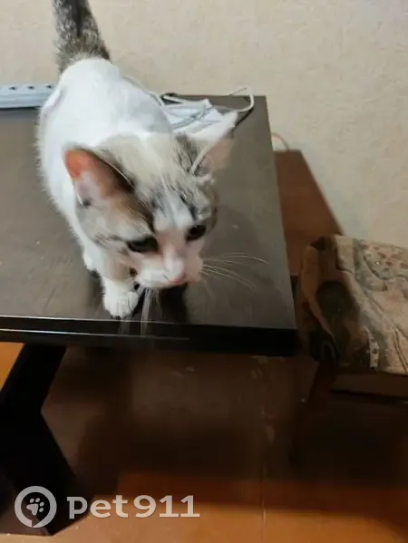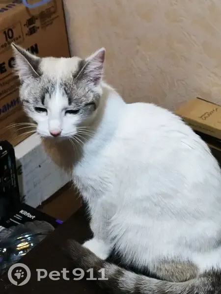 Окрас белый с маской на голове и розовыми ушками, есть бежевое пятнышко ближе к хвсту и тёмный хвост, гладкошерстная. Ласковая, проситься на руки, пытается облизать. Бегала у дома, звала хозяйку. Коготки пострижены, ушки чистые.