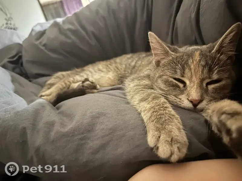 Серая с белыми и бежевыми полосками, прыгнула на улице на руки, видно, что домашняя. На самом конце хвоста белое пятно. Вся тряслась и очень хотела кушать.