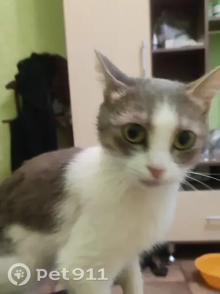 Серо-белая кошка, возраст предположительно около года, чистая, ласковая, домашняя. Возможно выпала из окна, так как больно наступать на лапку. Была напугана, просила помощи...